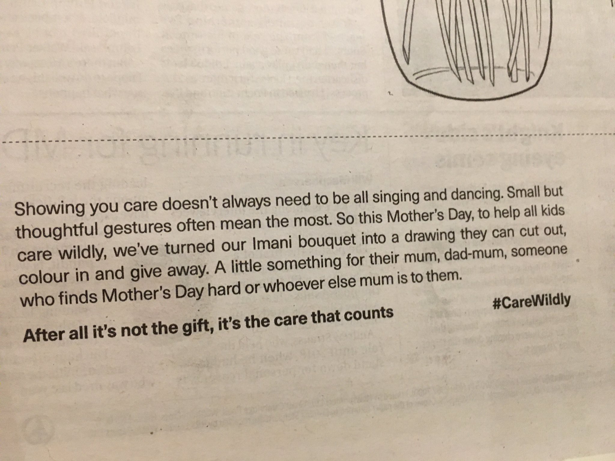 A simple Mothers Day brief became an ad that doesn’t sell anything - just a line drawing that you rip out the paper, colour in and give to your Mum to show them how much you care.